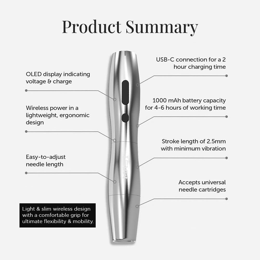 The Mast P20 delivers versatile performance with a 2.5 mm stroke length, helping to minimize skin trauma. It is suitable for all skin types and ideal for a wide range of PMU procedures, including brows, lips, eyeliner, and facial scar treatments. With an adjustable voltage range of 4–10V, you can efficiently create realistic hair strokes, crisp lines, soft pixels, and smooth shading.