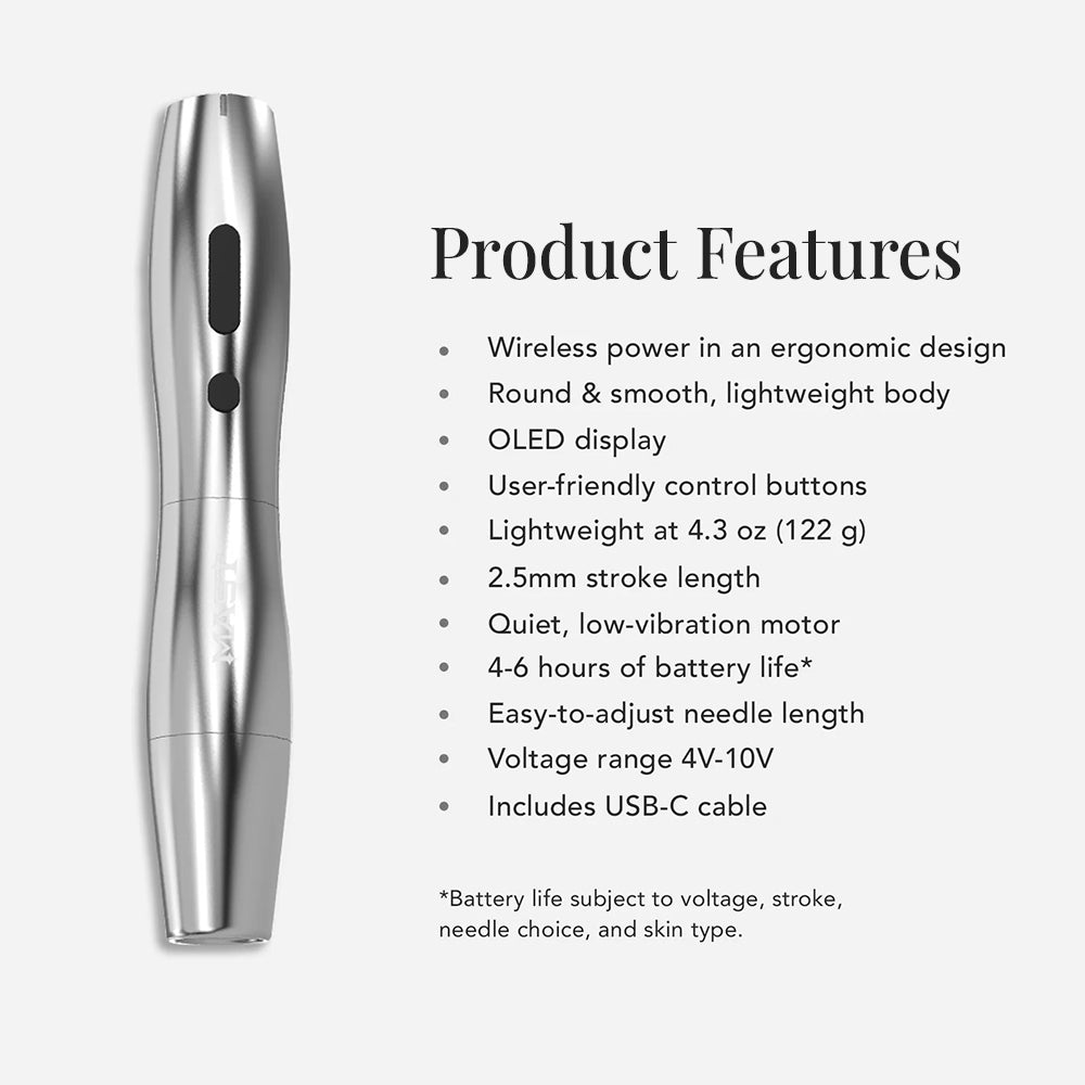 *USB-C charging block not included. Wireless only – cannot be used with a power supply. Unscrew the battery from the lower body to reveal the USB-C charging port. Battery life is subject to voltage, stroke, needle choice, and skin type.