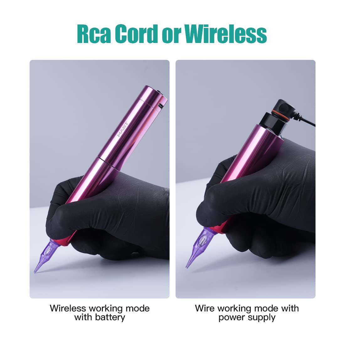 Mast Tour Y22’s stroke is 3.0mm, apt for all style tattoos. It can do everything from new school to old school to lining coloring. Two modes can be used: One works with a battery, and another with an RCA cord.